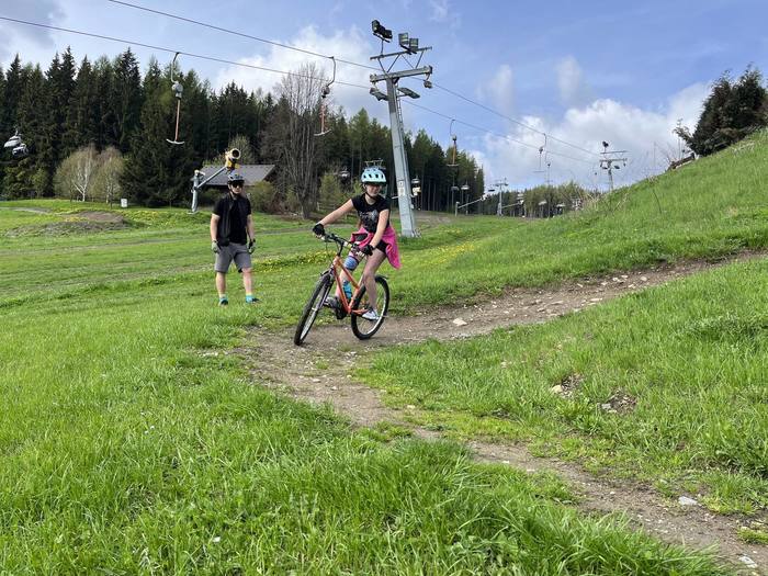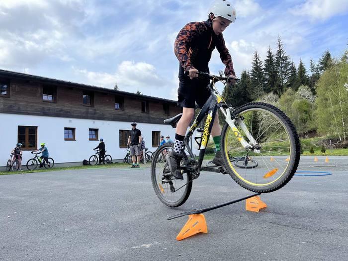 Minulý týden proběhl již třetí ročník „Bajkového kurzu". Tento název získal, jelikož není možné ho označit pouze za cyklistický. Pro vysvětlenou: Cyklista se snaží najet, co nejvíce kilometrů, ale „bajker" hledá potěšení také ve sjezdových dovednostech na tratích vytvořených přírodou nebo na uměle postavených stezkách. Žáci šestých tříd tak měli možnost vyzkoušet, jaké je to šlapat do kopce, jet v klopené zatáčce, nadhodit si přední kolo, vyskočit, správně na kole stát a v neposlední řadě se dobře oblékat. Minulý týden byl ve znamení deště a chladnějšího počasí. „Není špatné počasí, jenom špatně oblečený bajker." „Zážitek nemusí být pozitivní, hlavně že je silný." Tato hesla zaznívala opravdu často. Nicméně všem zůstala dobrá nálada a úsměv na rtu až do konce. Je pravda, že tomu možná napomohla výborná strava a wellness centrum :).