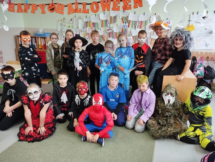 Dnes jsme se učili po halloweensku. Paní učitelka pro nás připravila zajímavé aktivity. Každý přišel v děsivém převleku a postupně plnil různé úkoly: „Hoď kostkou a poskládej srandovní větu, Vypočítej si obrázek, Zašifruj příklad pro kamaráda", pochutnali jsme si na upečeném pavoučkovi nebo si na památku vyrobili z vlny malého ducha.‘ Tento den byl úžasný a my si spolu užili spoustu zábavy.