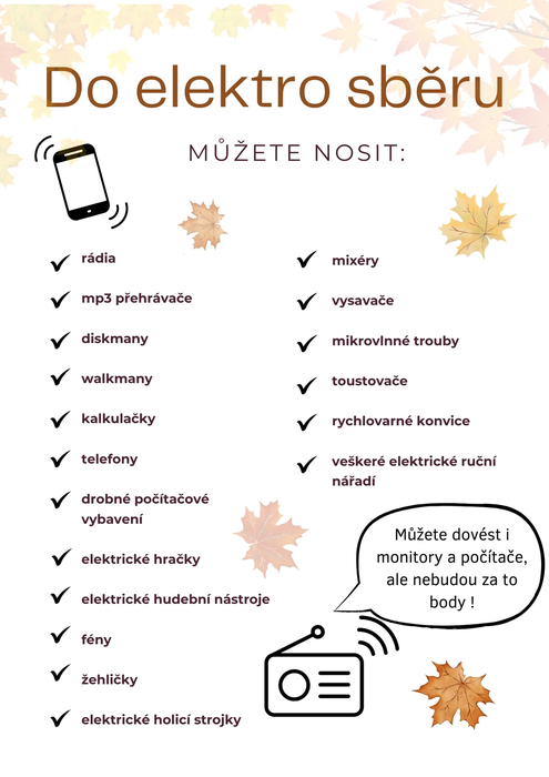 v úterý 8. 10. 2024 proběhne na naší škole sběr drobného elektra. Nosit můžete rádia, mp3 přehrávače, diskmany, walkmany, kalkulačky, telefony, drobné počítačové vybavení, elektrické hračky, elektrické hudební nástroje, fény, žehličky, elektrické holicí strojky, mixéry, vysavače, mikrovlnné trouby, toustovače, rychlovarné konvice, veškeré elektrické ruční nářadí a další.
